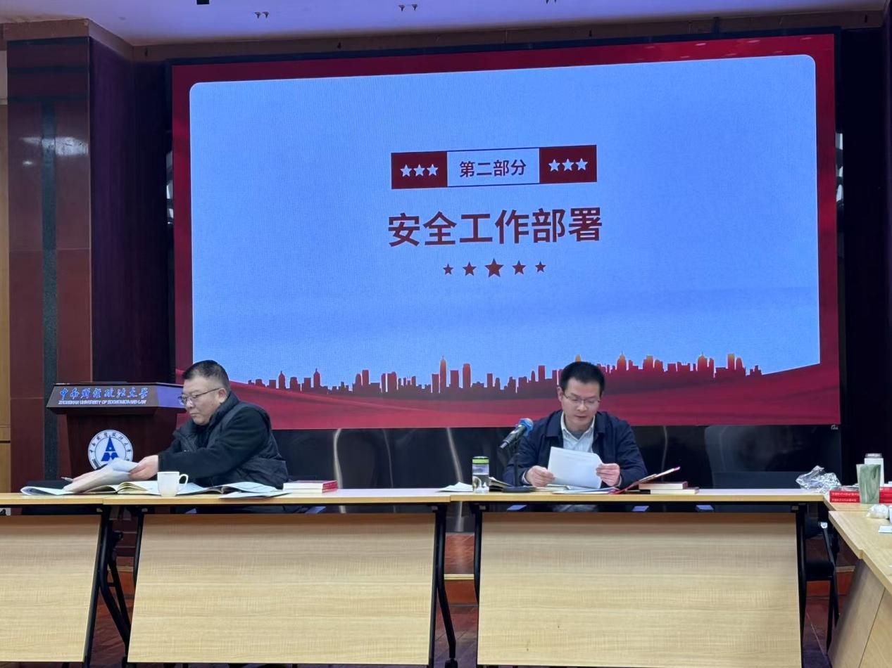 安全工作部署环节,由范献龙宣读《中南财经政法大学2025年消防安全目标管理责任书》,并汇报了《党委学生工作部安全稳定工作情况》,强调要做好安全责任落实、安全检查与排查、安排值班值守等相关工作,并提醒党员同志们要提高自身安全意识和防范能力。