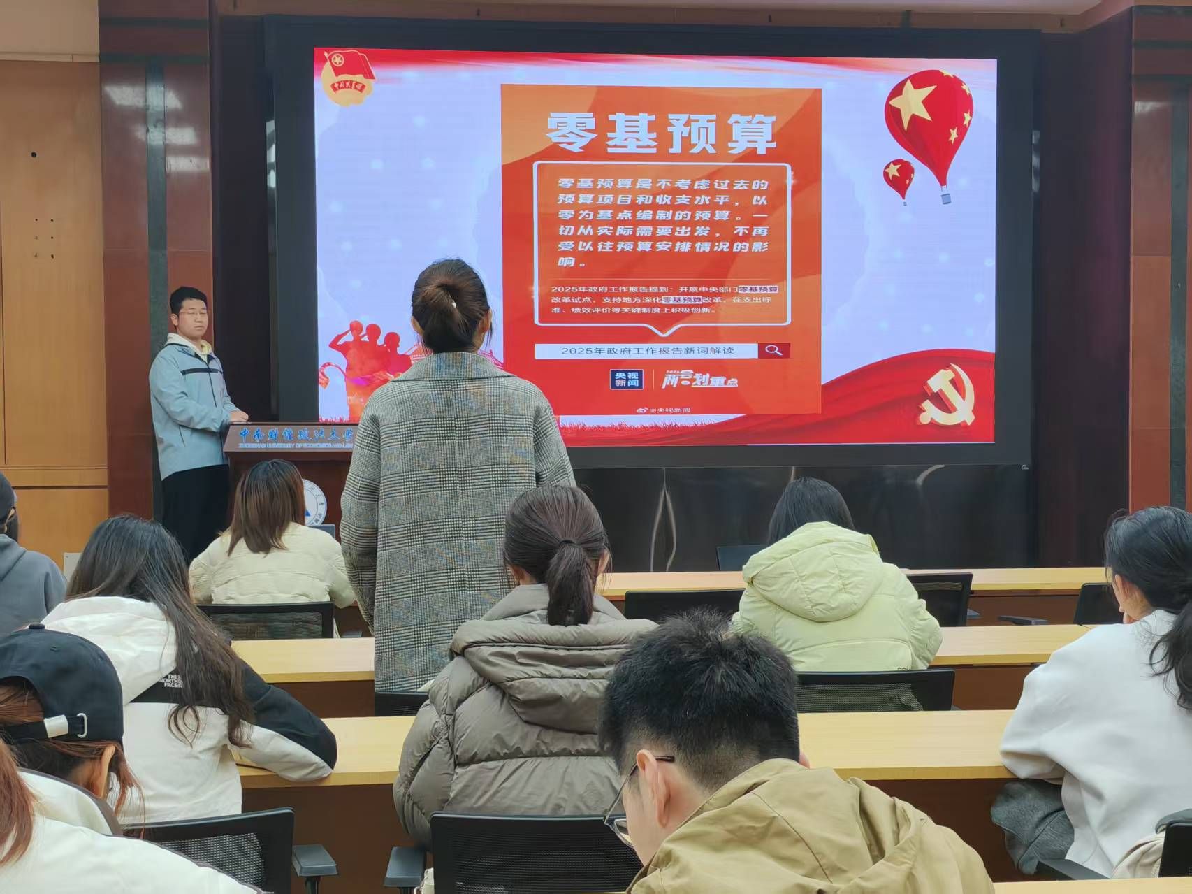 团日活动开始前,全体营员奏唱团歌。在“学习两会知识”环节,围绕两会召开时间、代表选举流程、政府工作报告要点等关键知识设置题目,以知识问答形式引导学员踊跃参与。通过“以赛促学”方式深化对中国特色社会主义民主政治制度的理解以及对两会的认识。在“聚焦核心议题”环节,高枫博详细阐述全国两会的核心议程,并组织观看习近平总书记重要讲话视频,解读政府工作报告中与青年群体息息相关的就业、消费、科研等问题。在“讨论关键信息”环节,高枫博挑选政府工作报告中的新术语和关键词,引导学员深入评议。李璇认为零基预算改革有助于提高财政资金使用效率,但也面临诸多挑战;张梦瑶指出“育儿补贴”政策有助于缓解人口老龄化问题;谢艺彤认为免费学前教育政策有助于减轻家庭教育经济负担……其他学员纷纷表达观点。