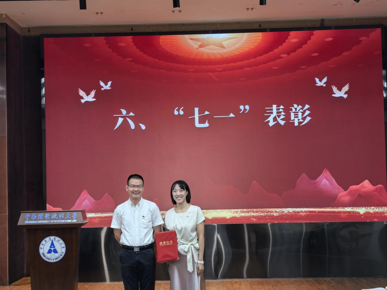 在表彰环节,范献龙宣读了《中共中南财经政法大学委员会关于表彰优秀共产党员、优秀党务工作者和先进基层党组织等的决定》,随后为获评学校“优秀教职工党员”称号的黄艳同志颁发荣誉证书。