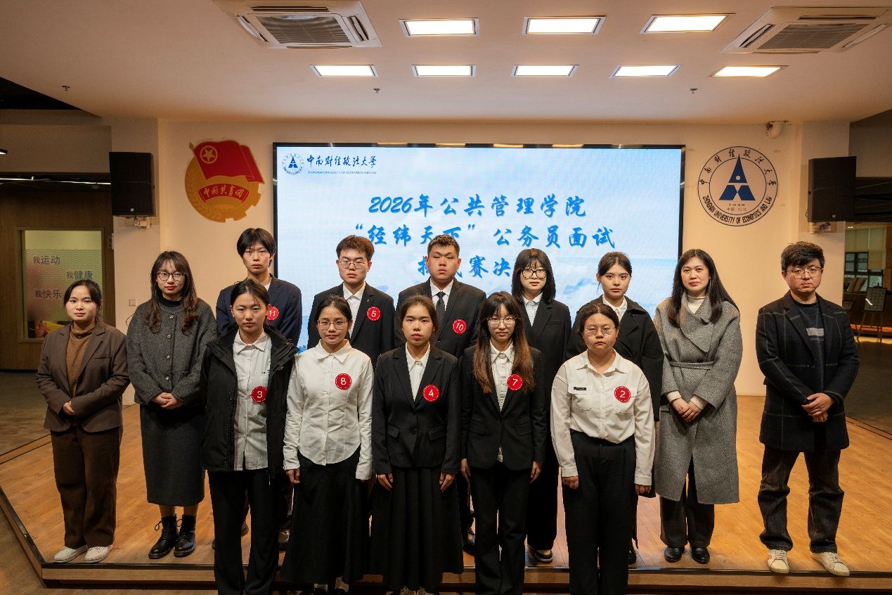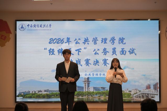 新闻网讯(学生记者 康瑞洋 张浩天 崔云鹏 洛桑德吉)为深入贯彻落实立德树人根本任务,积极构建“四全育人”格局,助力学生夯实专业基础、厚植家国情怀,中南财经政法大学公共管理学院于3月中下旬成功举办2026年“经纬天下”公务员面试挑战赛。本次赛事涵盖赛前讲座、笔试初赛与面试决赛三个环节,旨在全面提升学生公务员考试应试能力与综合素养。