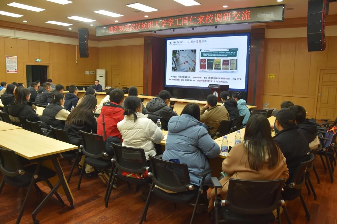 随后,双方在文潭楼四楼召开调研交流座谈会。黄小妹对武汉纺织大学的来访表示热烈欢迎,期待两校深化交流、增进合作。范献龙围绕我校学生工作体系作主旨分享,从学校办学历史切入,重点就思想引领阵地建设、学生骨干梯队培养、日常管理服务优化、学业精准帮扶机制、心理健康教育体系、资助育人模式创新等六大核心板块,详细介绍了我校的具体做法、特色经验与实践成效。