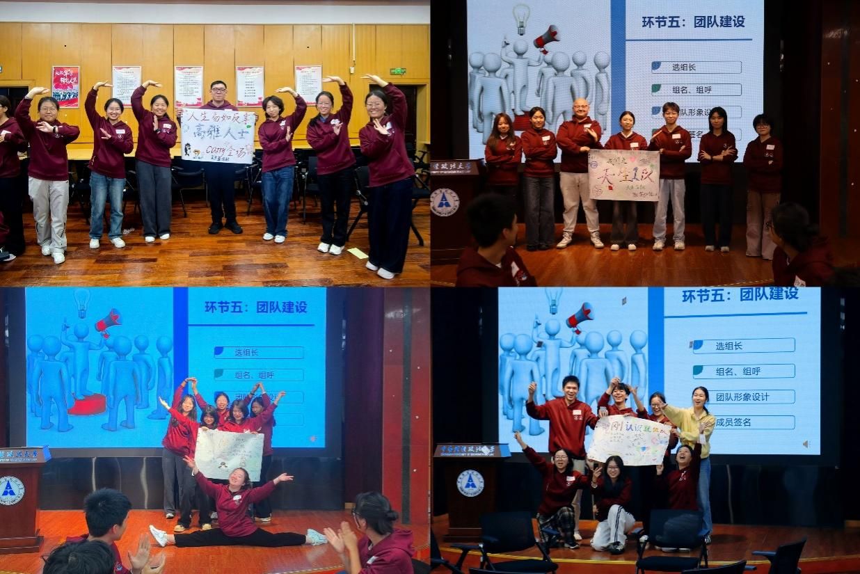 在团队建制环节,各组成员在限定时间内高效完成自我介绍、组长推选、队名拟定、口号创作及形象设计等任务。最终,各小组通过代表介绍组员、全员登台展示的方式,充分呈现了独具特色的团队文化与精神风貌。